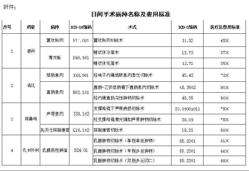 7个病种包括眼科的翼状胬肉、青光眼,消化科的结肠息肉、直肠息肉,耳鼻喉科的声带息肉、先天性耳前瘘管,乳甲外科的乳腺良性肿瘤。12种术式具体指翼状胬肉切除术、睫状体冷凝术、睫状体光凝术、经电子内镜结肠息肉激光切除术、直肠-乙状结肠镜下直肠息肉切除术、经内镜直肠良性肿物切除术、支撑喉镜下声带病损切除术、经支撑喉镜激光辅助声带肿物切除术、耳前瘘管切除术、乳腺肿物切除术(单侧单发肿物)、乳腺肿物切除术(单侧多发肿物)、乳腺肿物切除术(双侧多发切口)。
