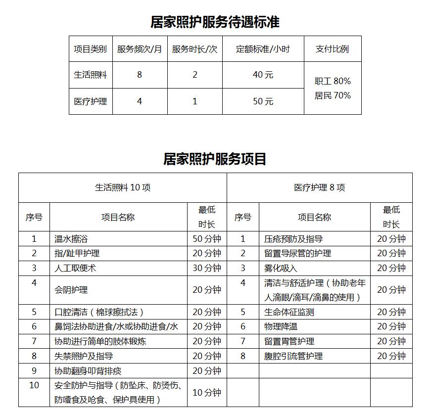 生活照料类项目主要有温水擦浴、简单肢体锻炼、失禁照护及指导等10项家庭自行护理较难开展的照料项目,每月可享受上门服务8次,每次服务时长2小时,服务定额标准为40元/小时。医疗护理服务主要有压疮预防及指导、留置管护理、雾化吸入等8项需求度较高的项目,每月可享受上门服务4次,每次时长1小时,服务定额标准为50元/小时。居家照护服务对象在住院、机构照护服务期间停止居家照护服务。