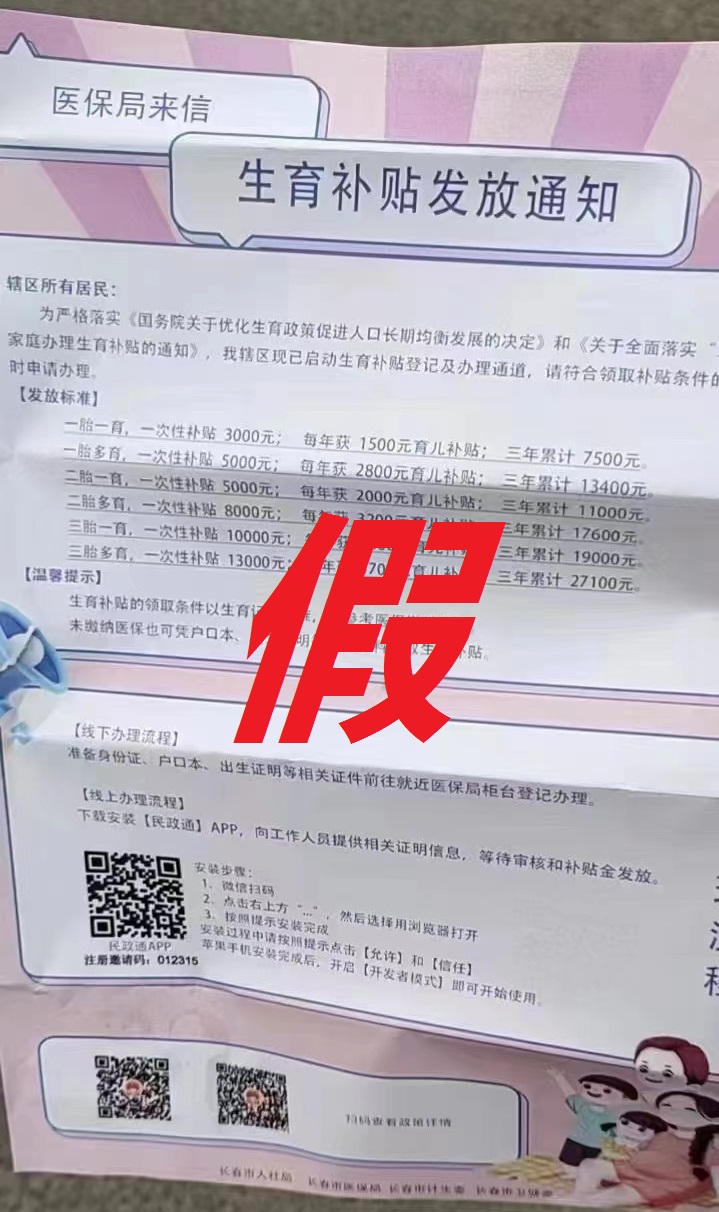 近日,发现有通过自媒体发放“医保局来信:生育补贴发放通知”的传单,称医保局发放社区生育补贴。